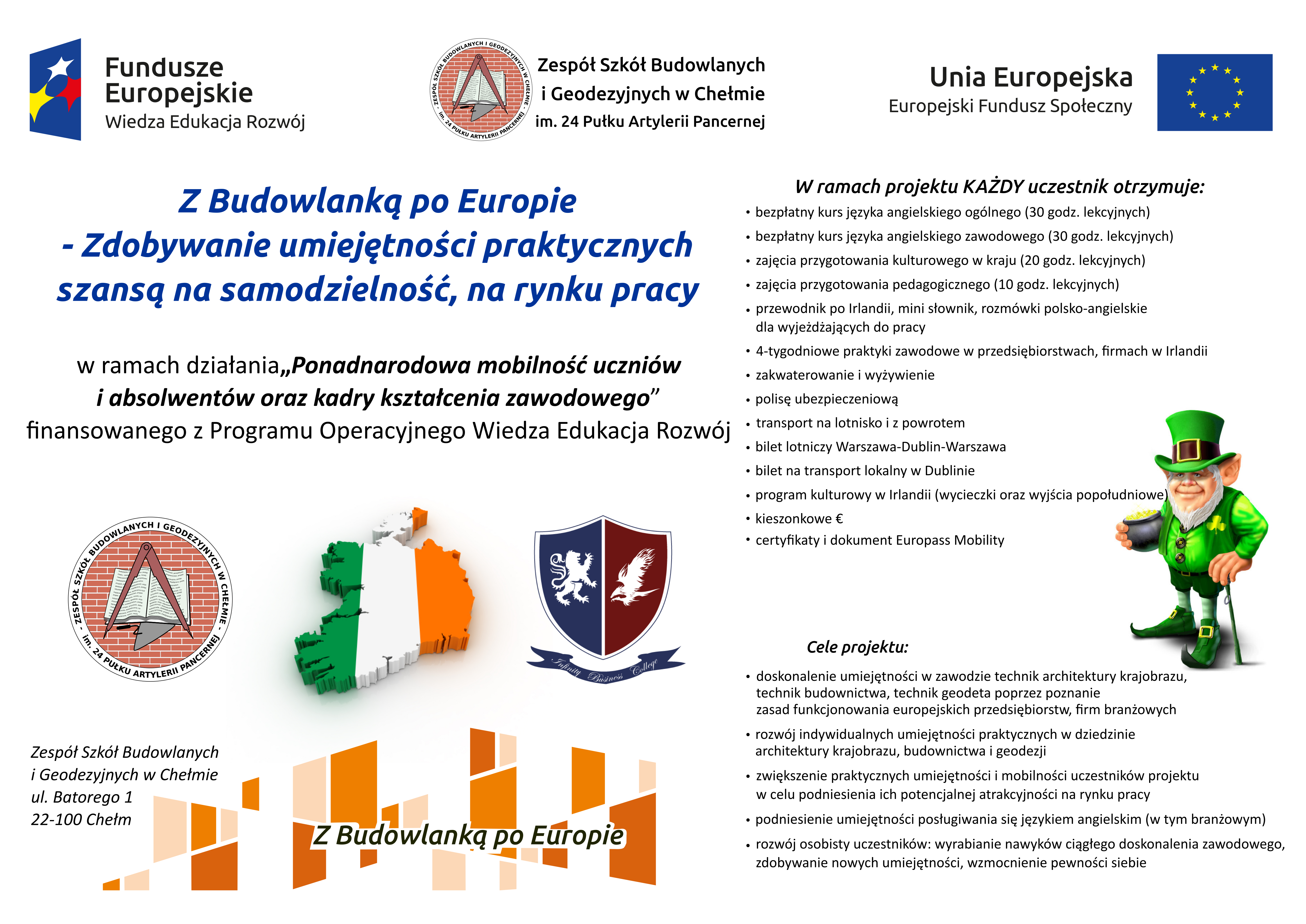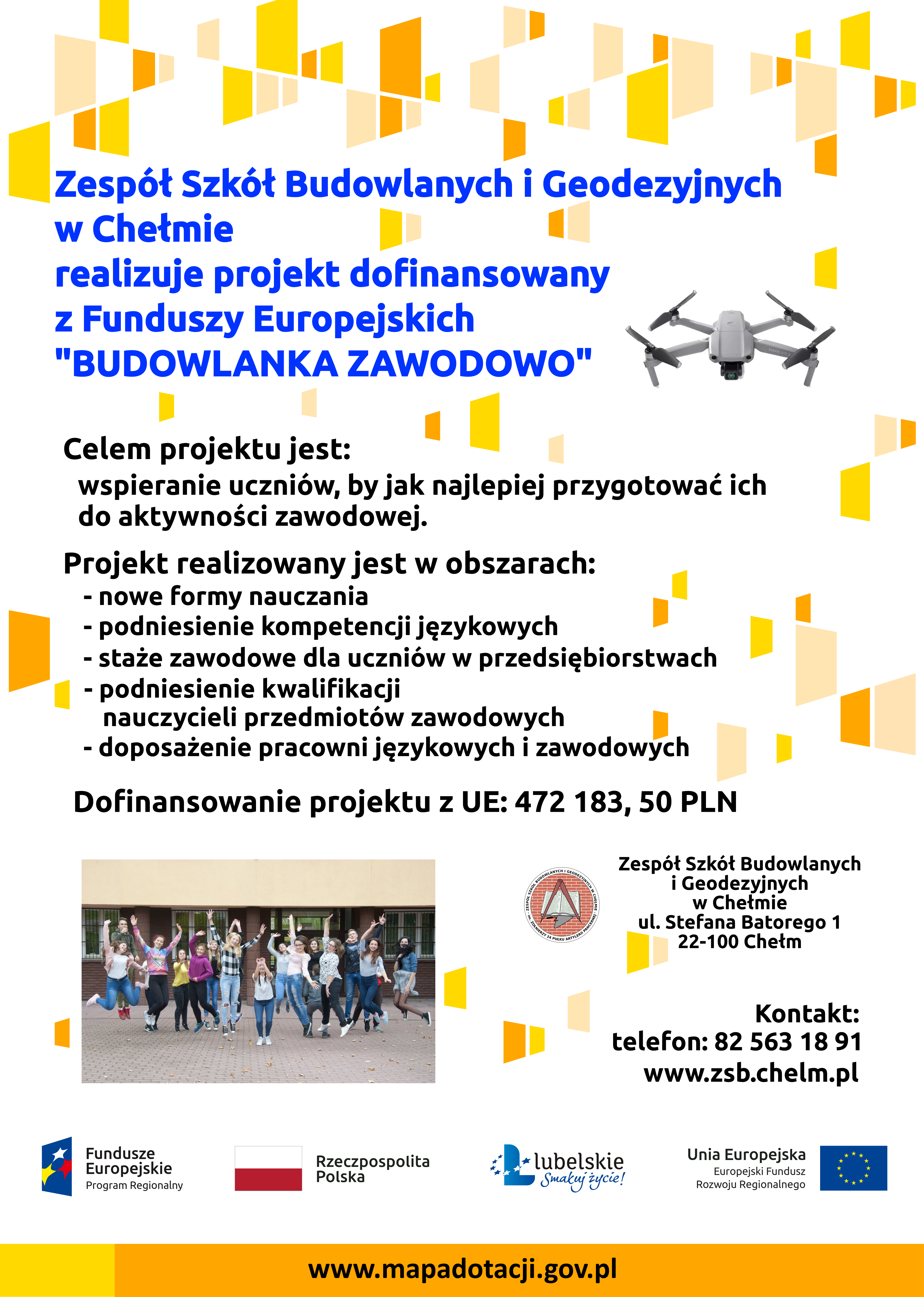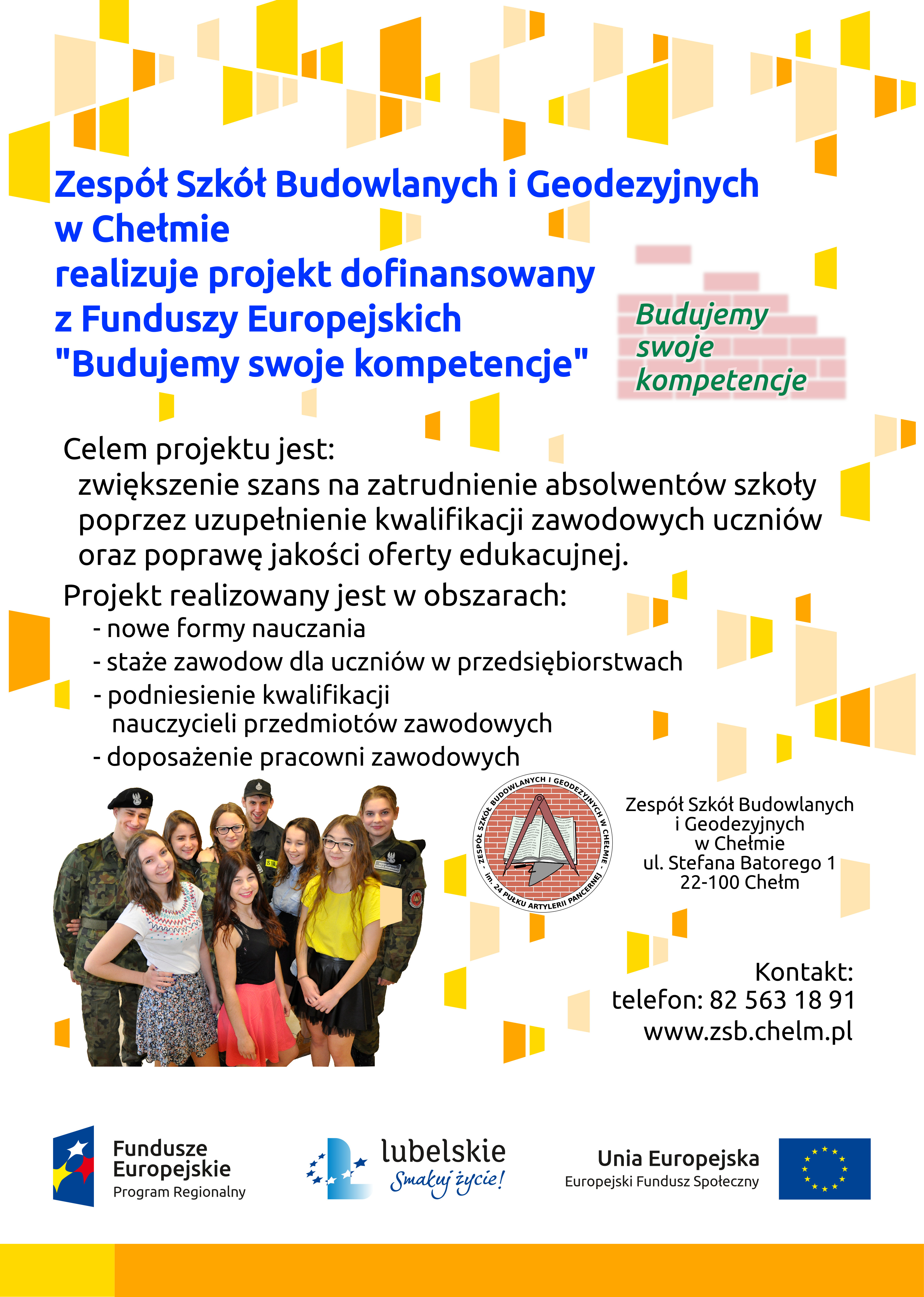 Projekt „Budowlanka zawodowo ” realizowany jest w ramach Regionalnego Programu Operacyjnego Województwa Lubelskiego na lata 2014-2020 współfinansowanego ze środków Europejskiego Funduszu Społecznego na podstawie umowy podpisanej z Województwem Lubelskim w imieniu, którego działa Zarząd Województwa Lubelskiego.